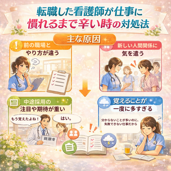 この記事では、転職した看護師が仕事に慣れるまで辛いと感じる理由をわかりやすく整理しながら、